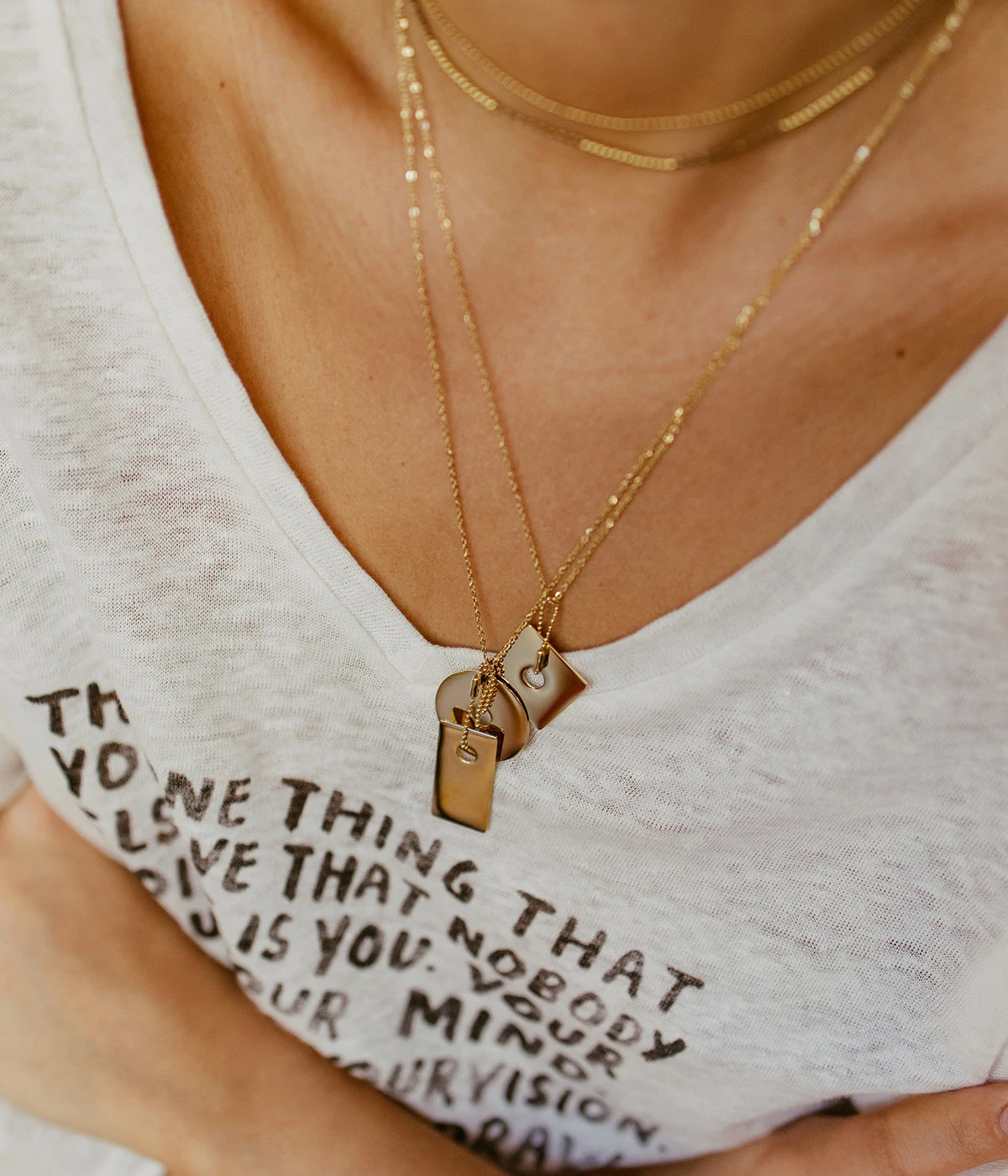 Collier à 3 rangs en acier uni ou doré à l’or fin sur lequel sont suspendus des pendentifs de forme géométrique.