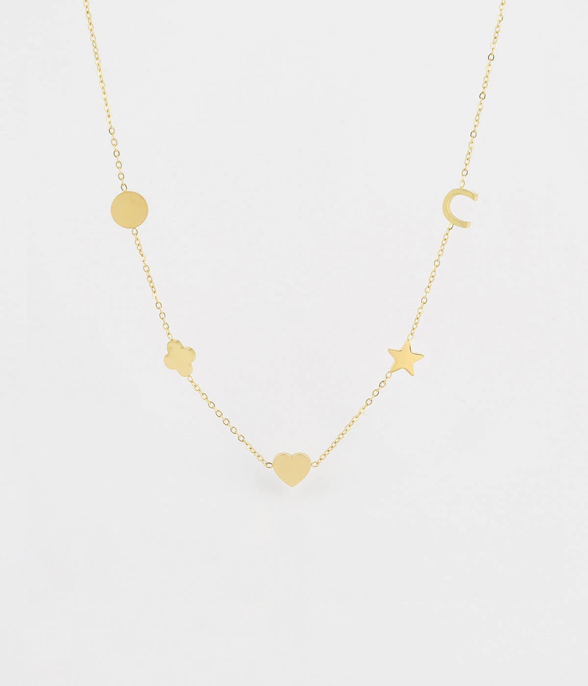Collier en acier doré à l’or fin sur lequel sont attachés des motifs ajourés en forme de cercle, fleur, cœur et étoile.