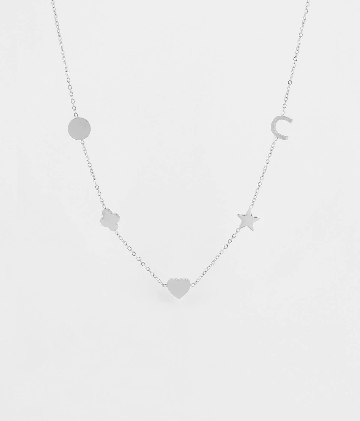 Collier en acier doré à l’or fin sur lequel sont attachés des motifs ajourés en forme de cercle, fleur, cœur et étoile.