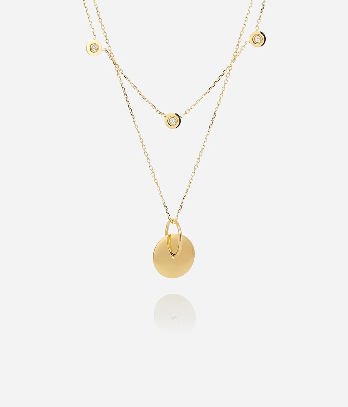 Sur la première chaîne se trouvent trois pastilles serties d’un zirconium en leur centre et sur la seconde chaîne, un pendentif avec un cercle dans un anneau.