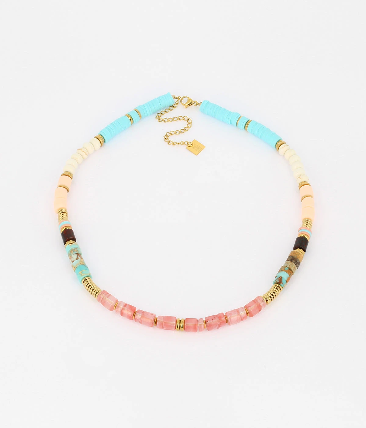 Collier en coton naturel, style surfeur, composé d’une enfilade de rondelles colorées de pierres naturelles et d’acier dorées à l’or fin.