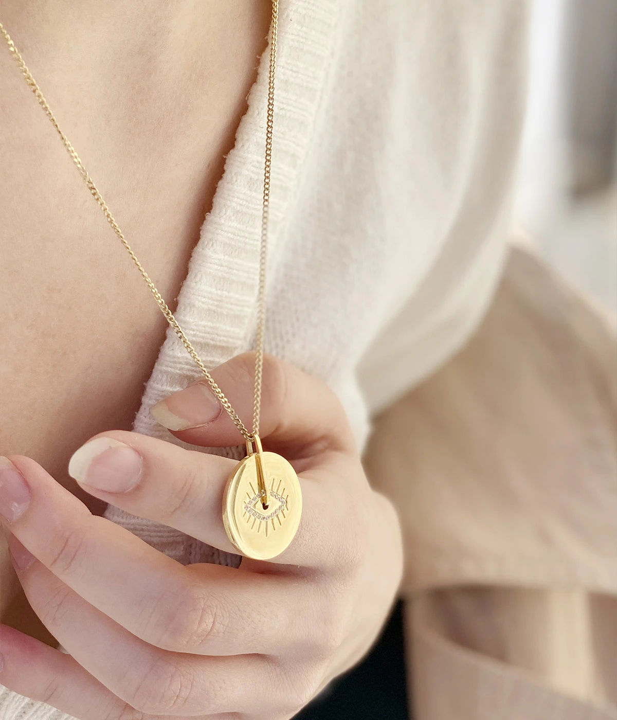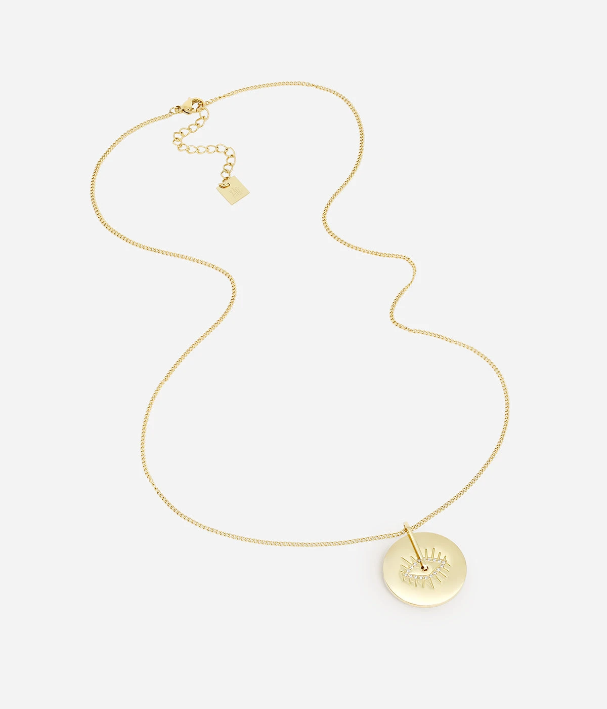 Collier en acier doré à l’or fin sur lequel est suspendu un pendentif gravé d’un motif représentant un œil sertis de zirconiums.
