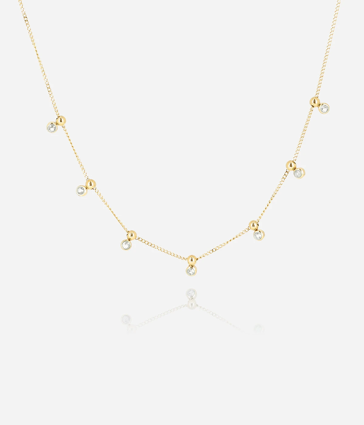 Collier en acier uni ou doré à l’or fin sur lequel se trouvent des petites pampilles en zirconiums colorés.