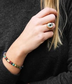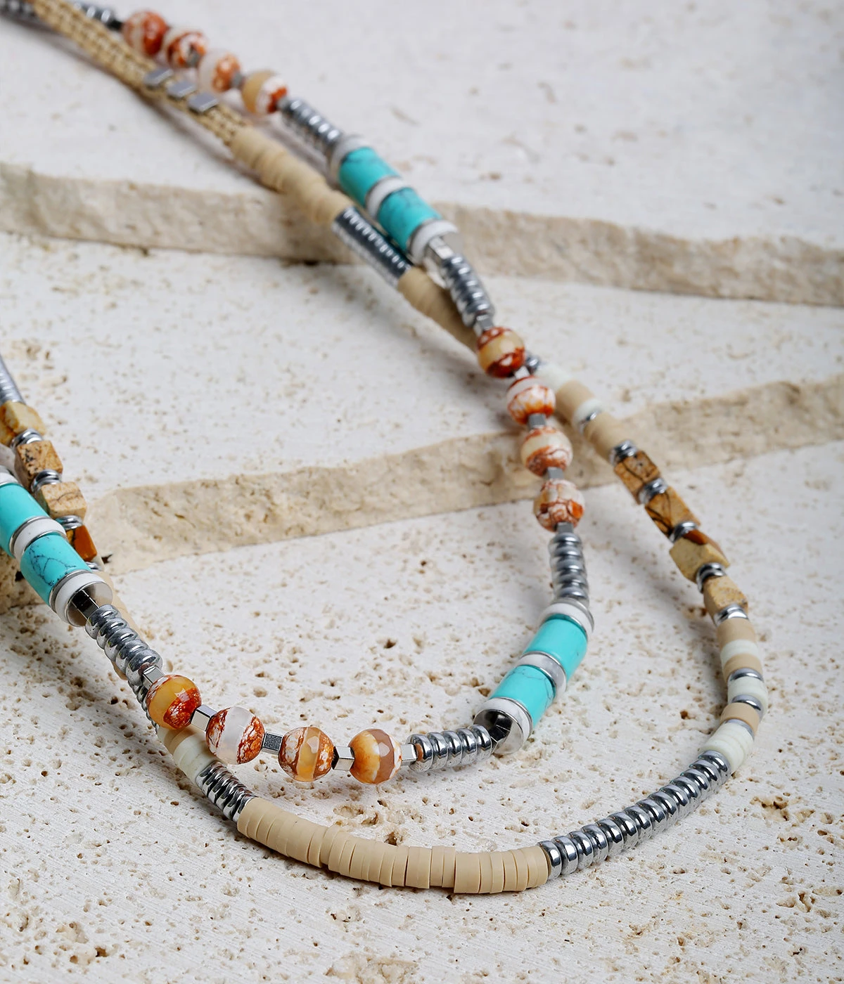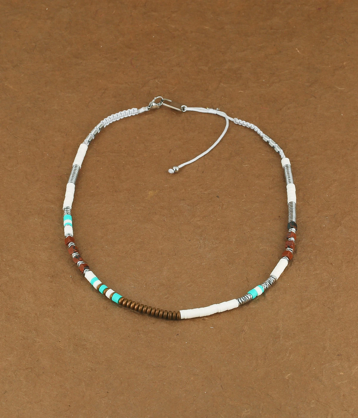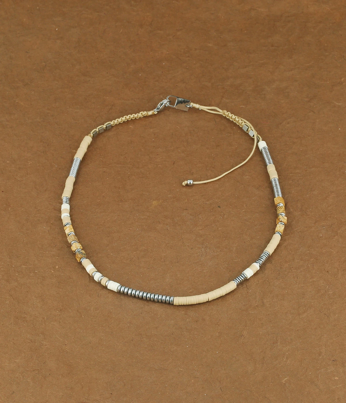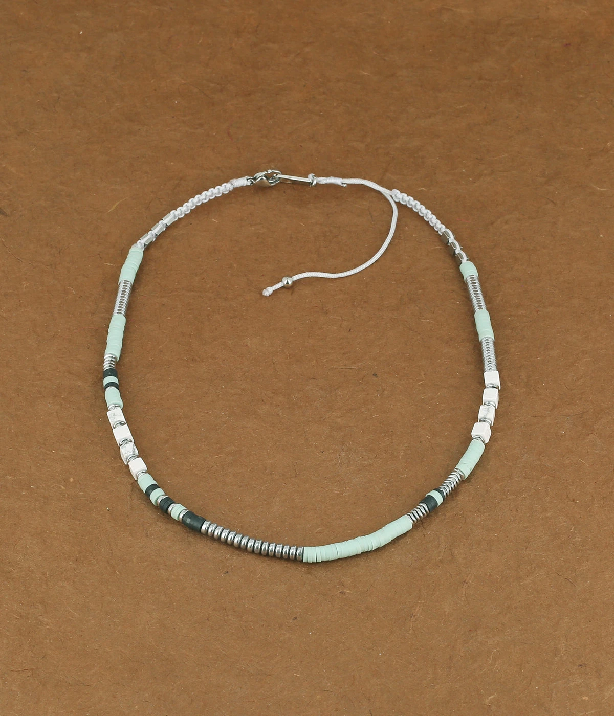 Collier cordon ajustable sur lequel sont enfilées des pierres naturelles et des rondelles d’acier uni.