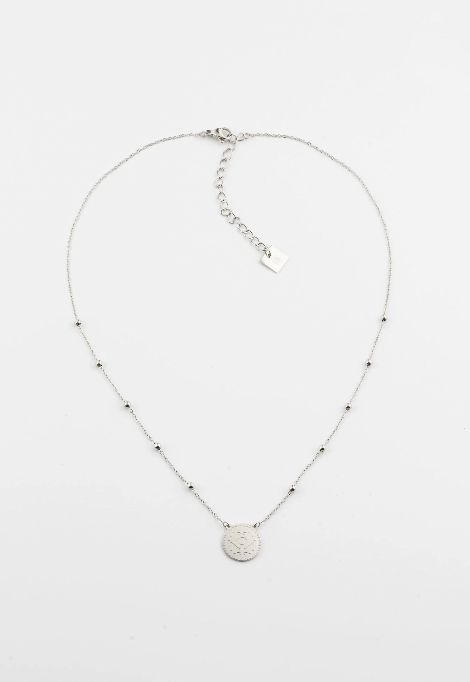 Collier chaînette en acier uni ou doré à l’or fin sur lequel est attachée une médaille gravée d’un œil protecteur inspiré de la mythologie égyptienne.