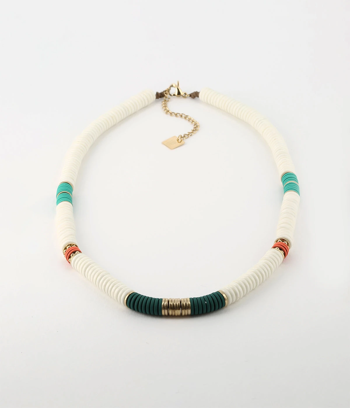 Collier surfeur composé de rondelles d‘howlite, d’hématite teintée et d’acier doré à l’or fin.