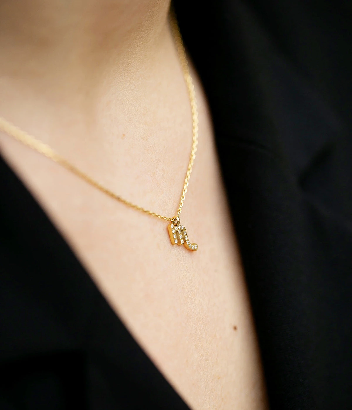 Collier en acier doré à l’or fin sur lequel se trouve un pendentif représentant le signe du zodiaque Scorpion, serti de zirconiums.