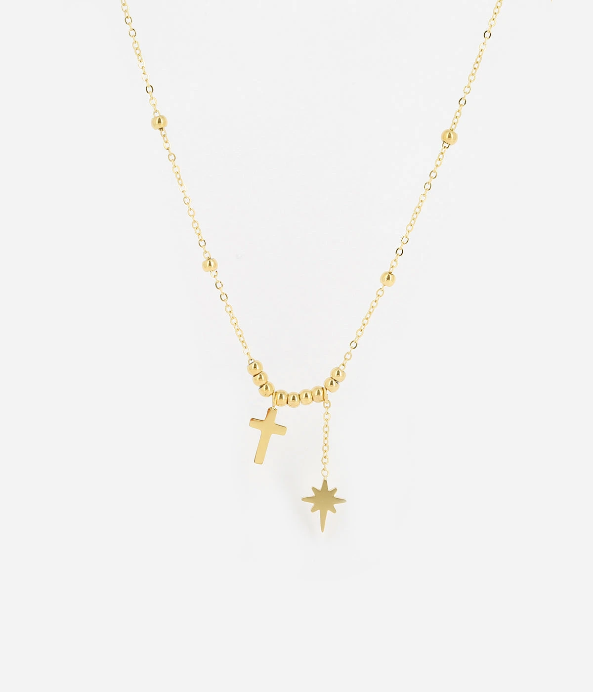 Collier en acier uni ou doré à l’or fin sur lequel sont enfilées des petites boules en acier et suspendus des petits motifs en forme d’étoile et de croix.