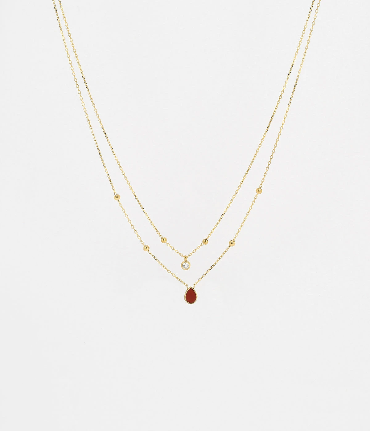 Collier en acier doré à l’or fin à double rang. Sur la première chaîne est attaché un zirconium et sur la seconde, une goutte colorée. Des petites boules d’acier doré sont présentes sur les deux chaînes.