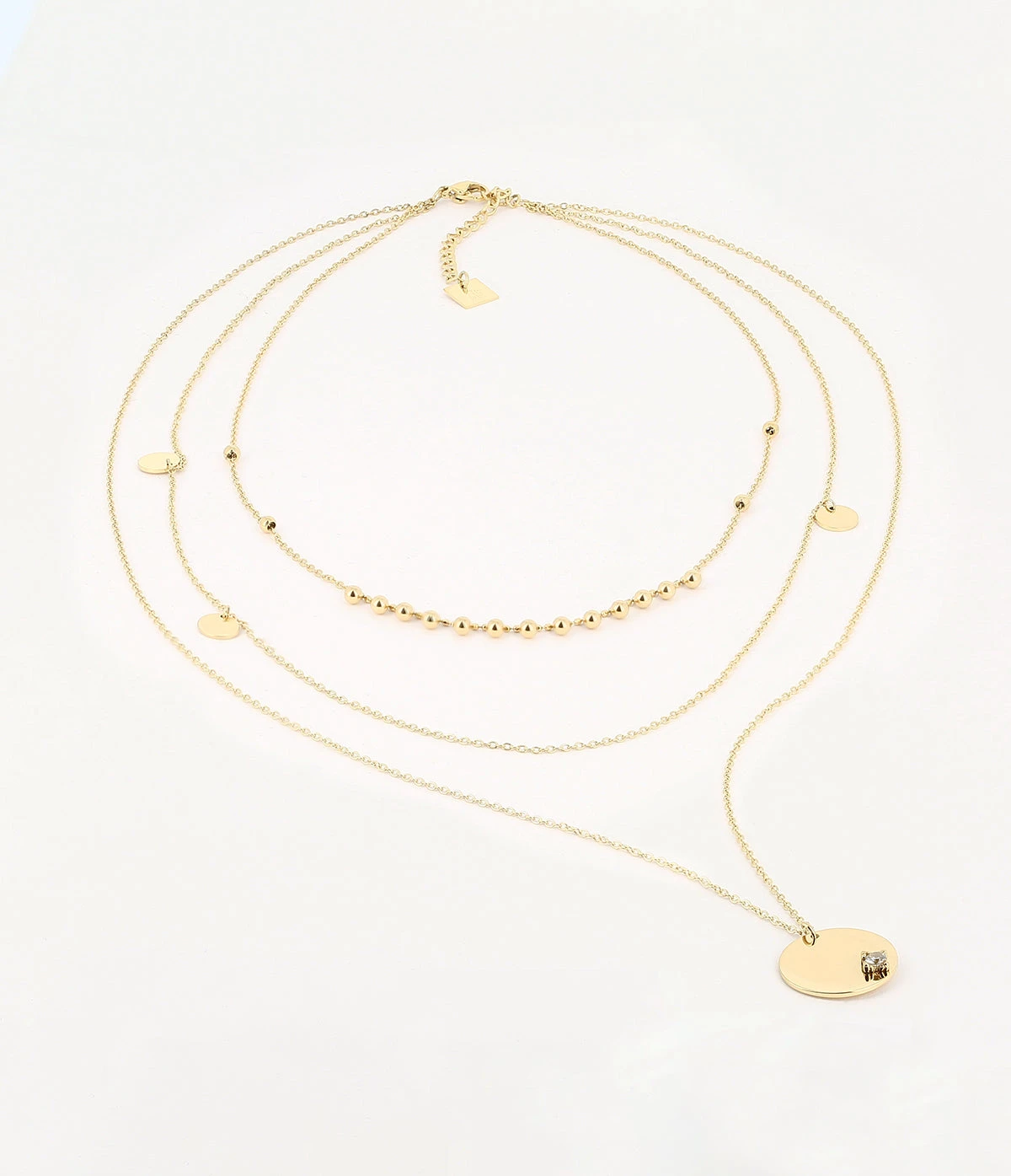 Collier multi-rang en acier uni ou doré à l’or fin sur lesquelles se trouvent des boules dorées et des médailles. La médaille centrale, habillant le décolleté, possède un zirconium en serti clos.