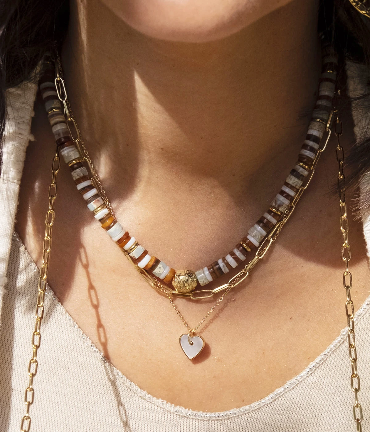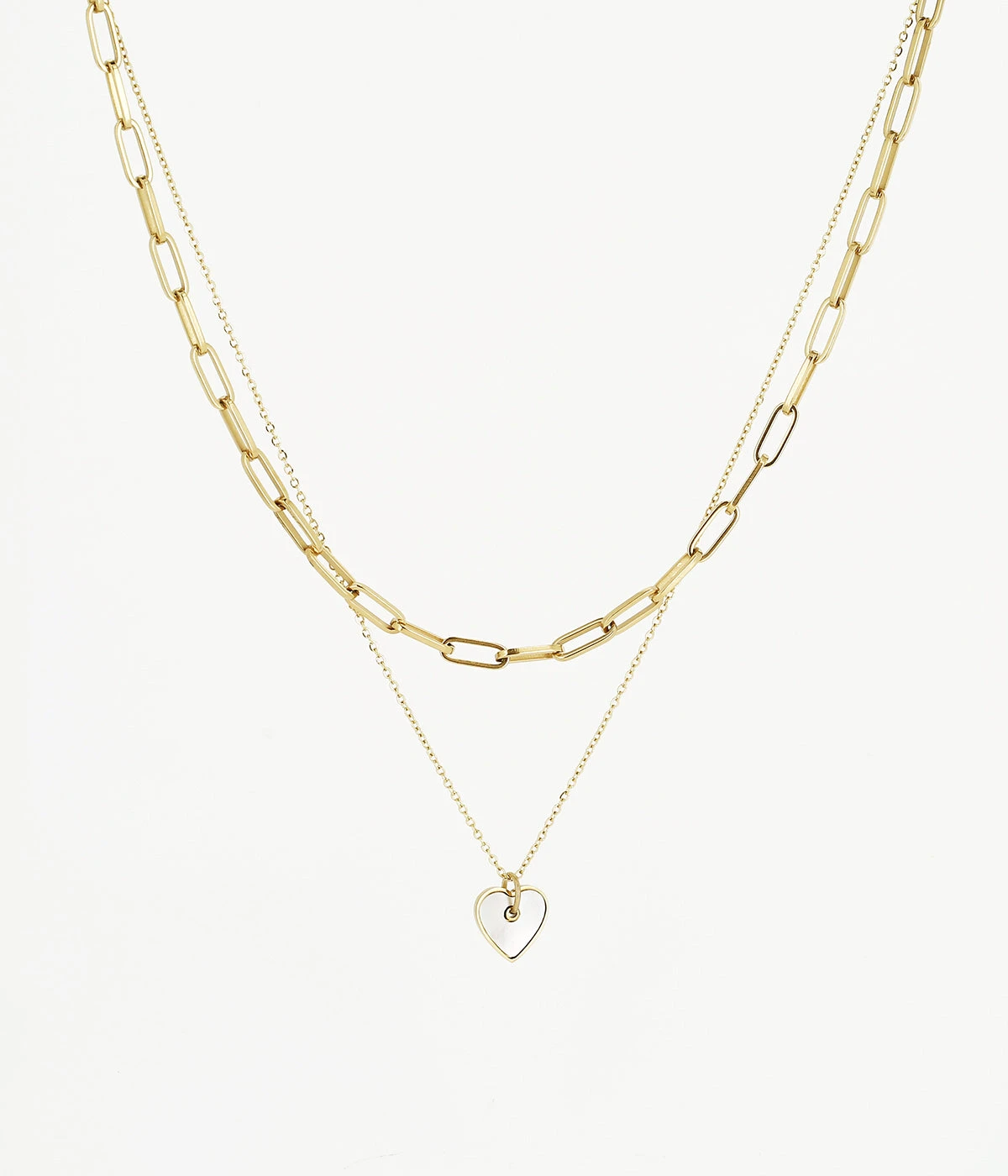 Collier double chaîne en acier doré à l’or fin sur lequel est accroché un petit cœur en nacre.