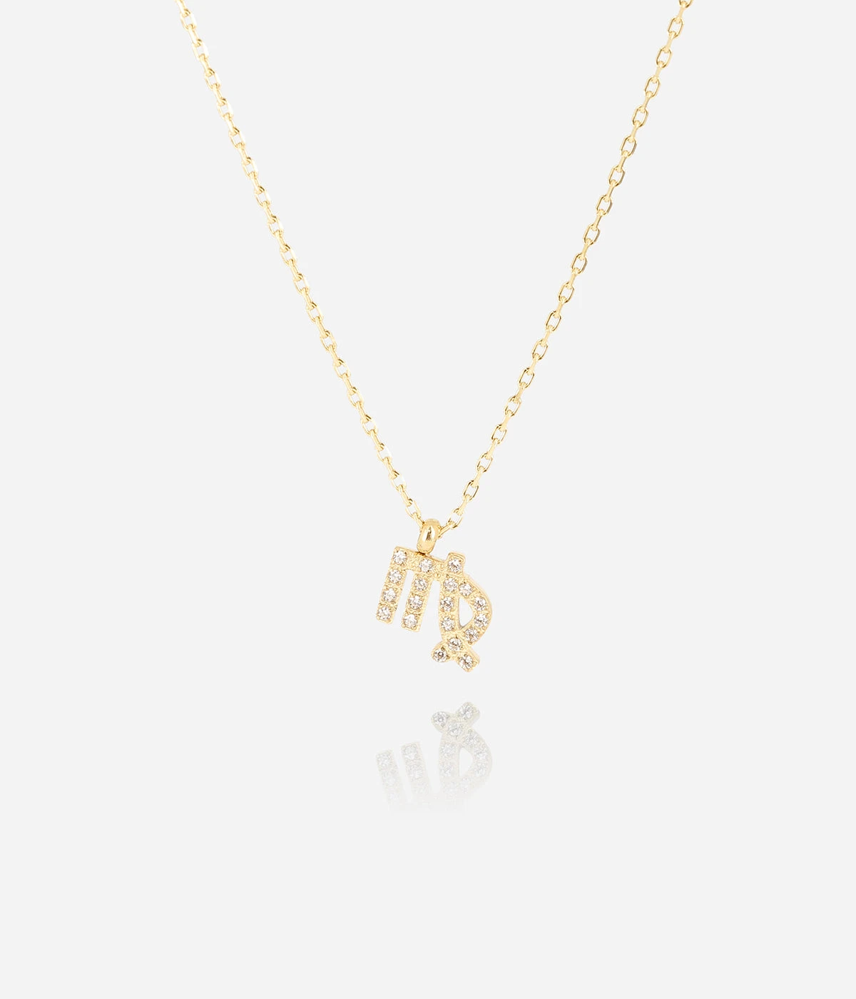 Collier en acier doré à l’or fin sur lequel se trouve un pendentif représentant le signe du zodiaque Vierge, serti de zirconiums.
