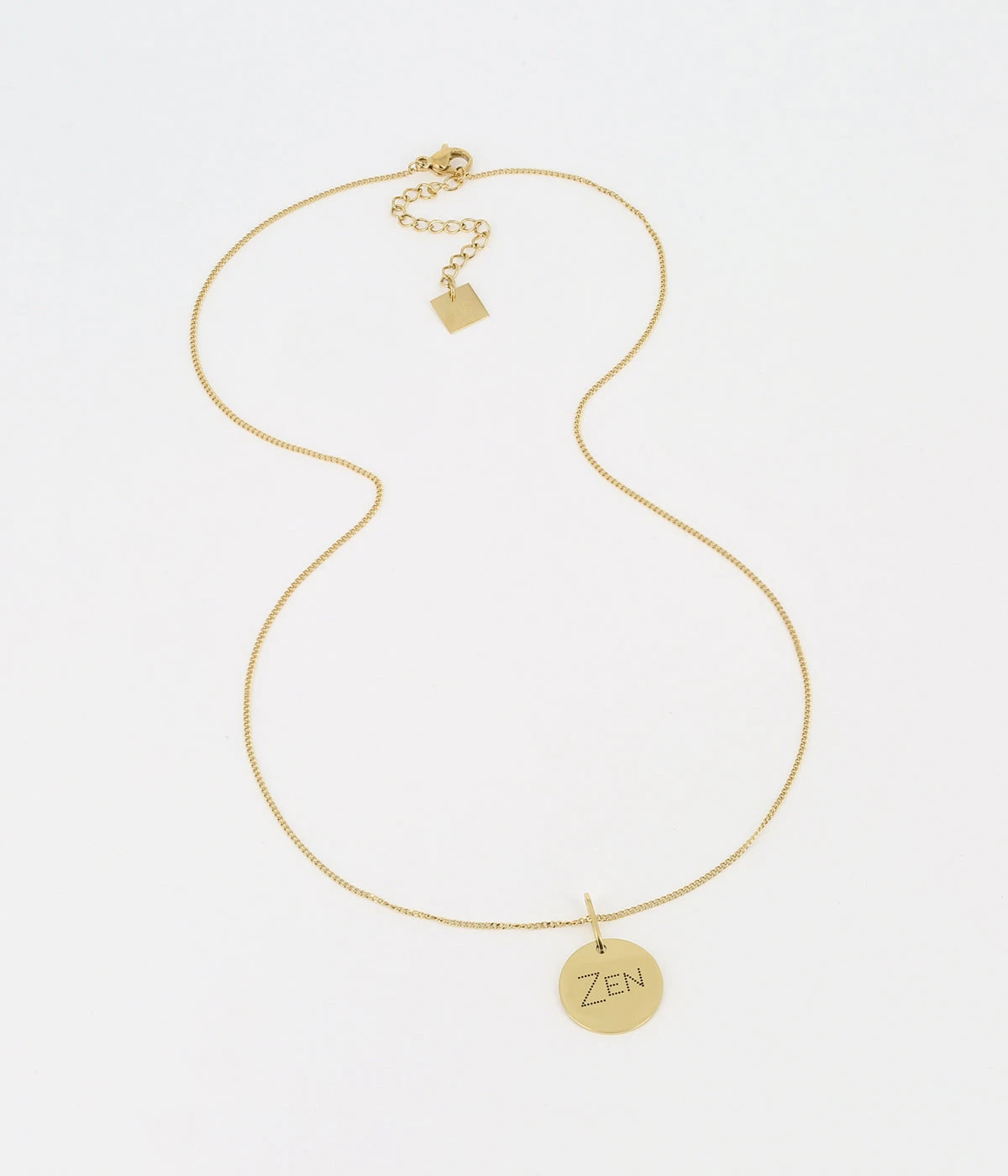 Collier chaîne en acier uni ou doré à l’or fin sur lequel une médaille gravée du mot « Zen » est attachée. La gravure est réalisée à la main dans nos ateliers et sa réalisation au petit point est pleine de délicatesse.