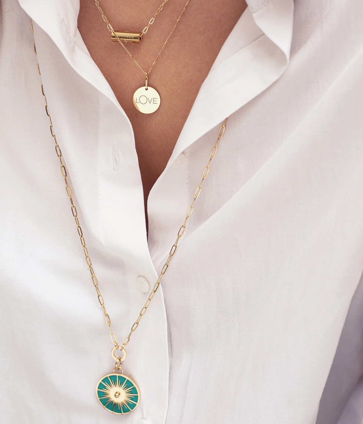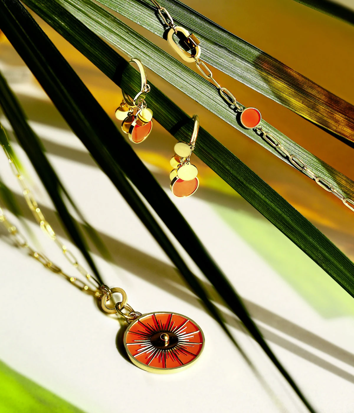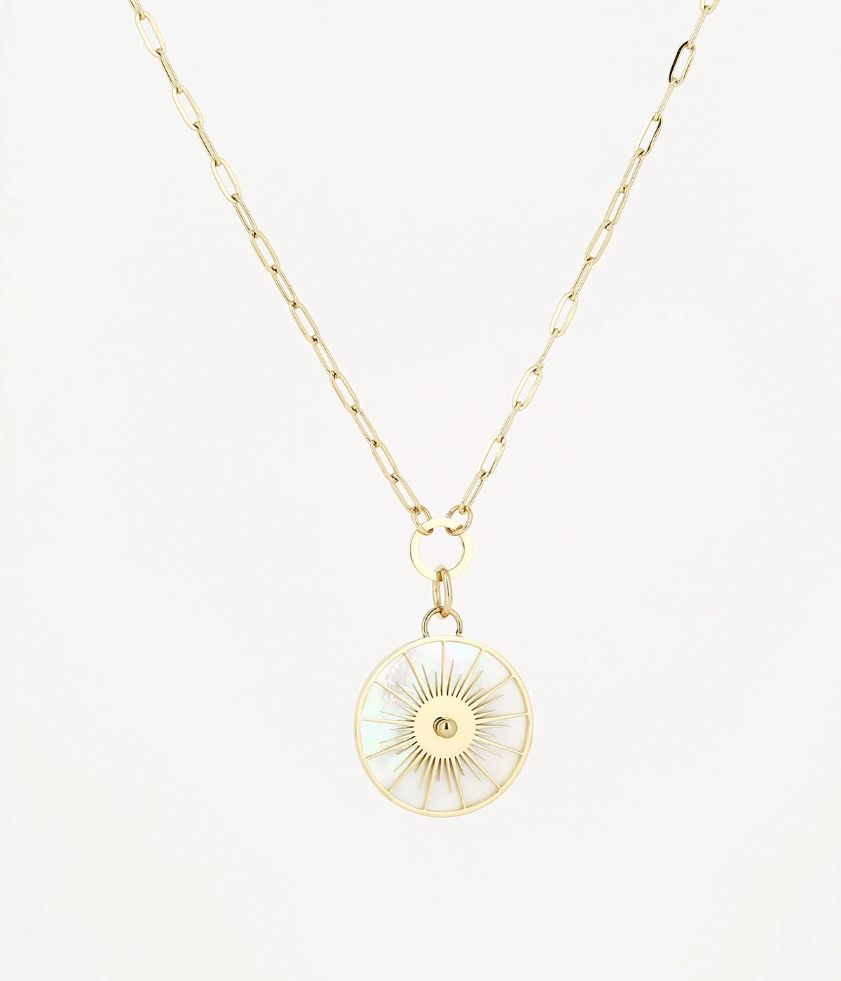 Collier long en acier doré à l’or fin sur lequel un motif ciselé d’un soleil d’or se place sur une médaille de nacre ou d’acétate de couleurs.