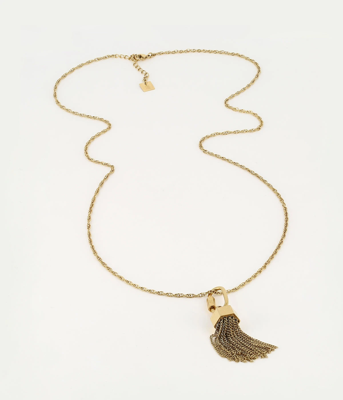 Collier long en acier uni ou doré à l’or fin sur lequel est attaché un pendentif accroché à un fermoir à vis.