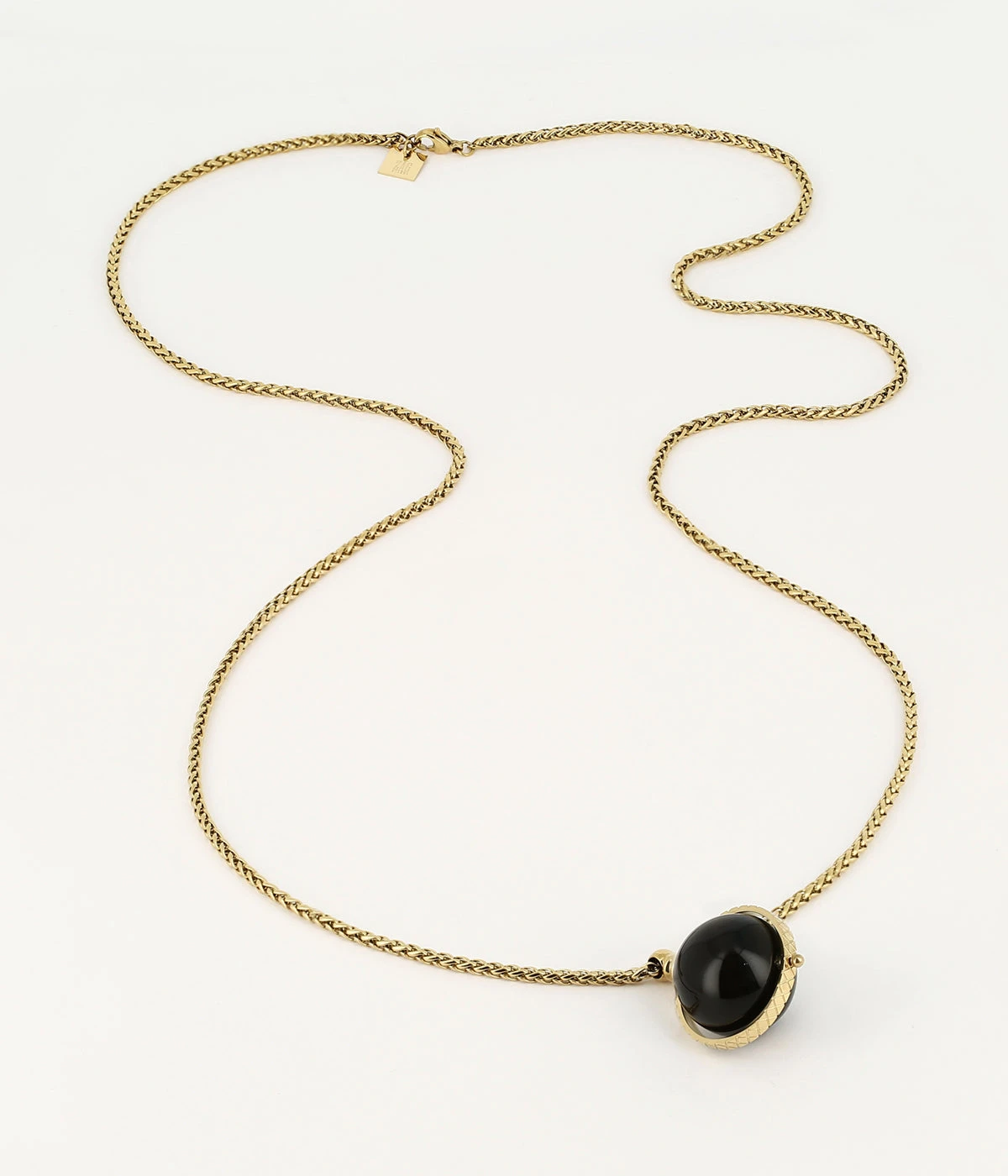 Collier long en acier doré à l’or fin sur lequel est attaché un pendentif possédant une pierre naturelle.