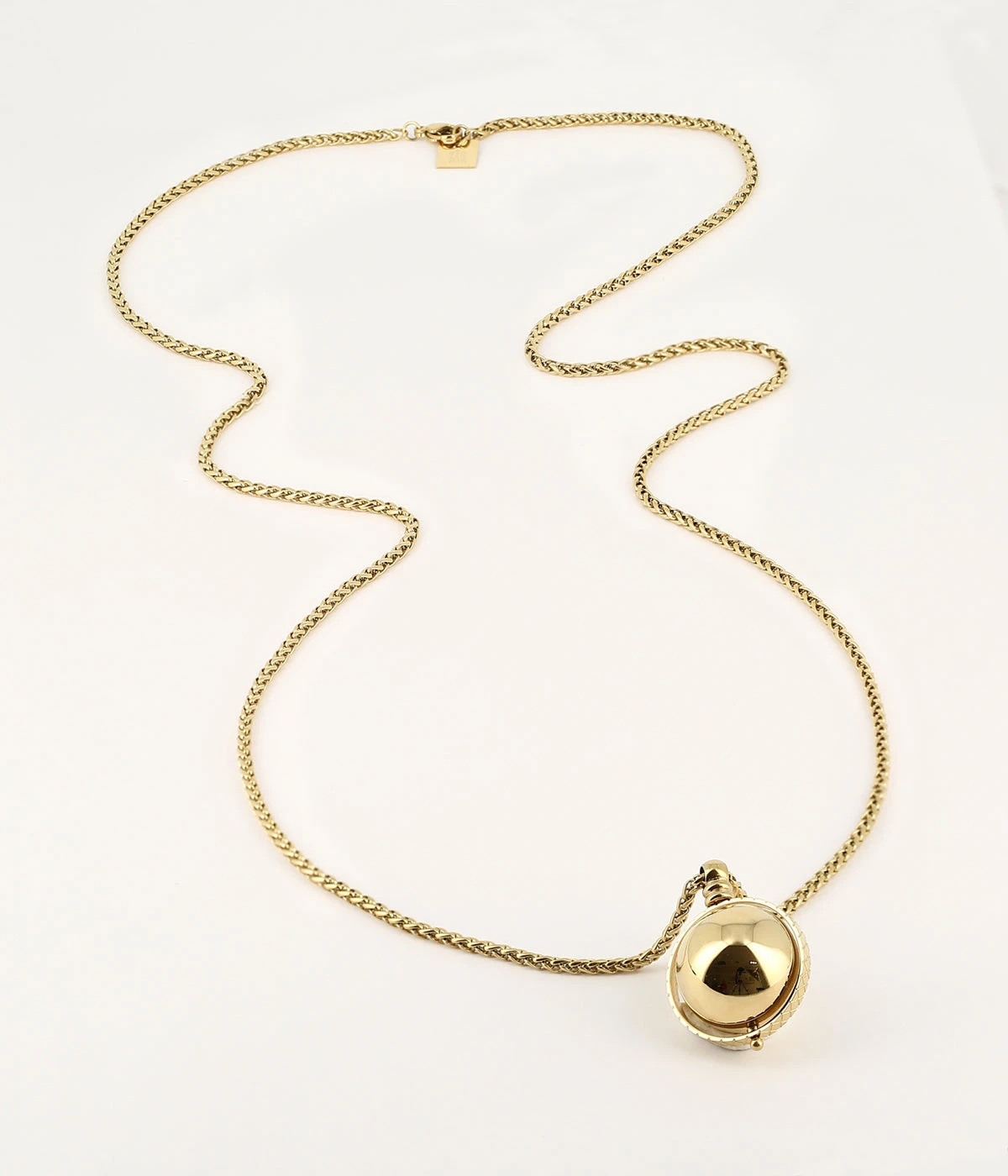 Collier long en acier uni ou doré à l’or fin sur lequel est attaché un pendentif possédant une boule en acier.