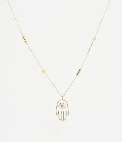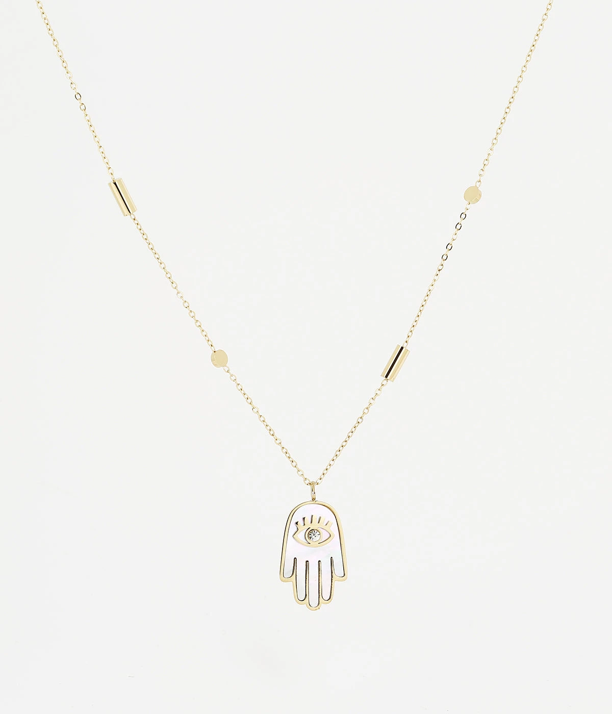 Collier long en acier uni ou doré à l’or fin sur lequel est attachée une petite main en nacre blanche.