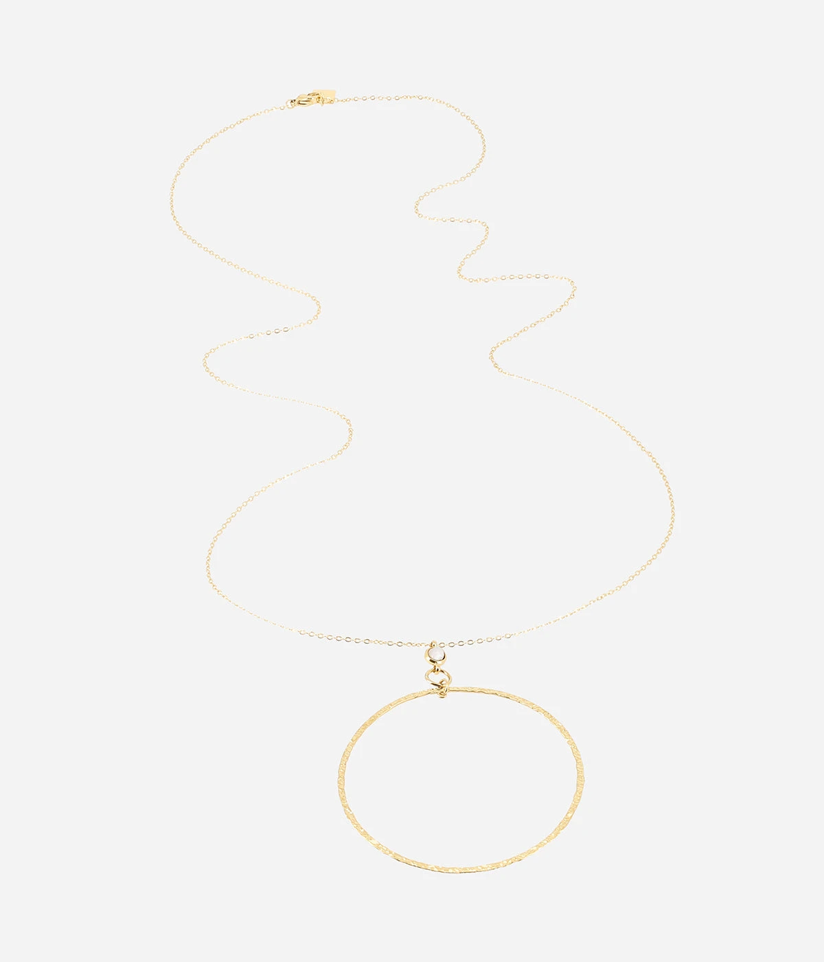 Sautoir en acier doré à l’or fin avec une petite pierre naturelle à la base qui relie un cercle martelé.