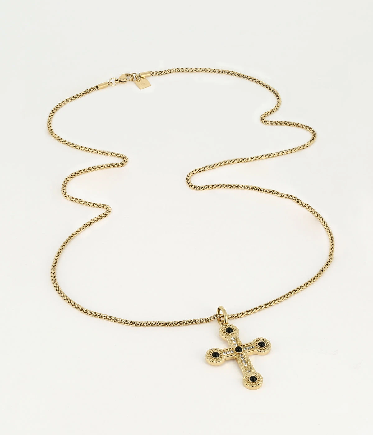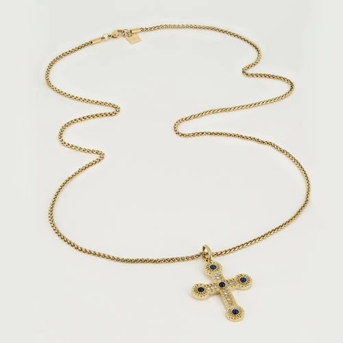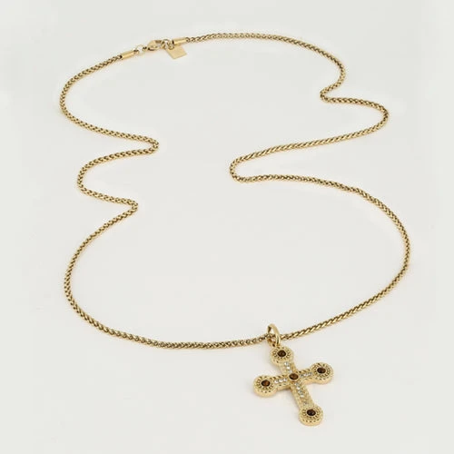 Collier long en acier uni ou doré à l’or fin sur lequel est suspendue une croix sertie de zirconiums et pierres naturelles.