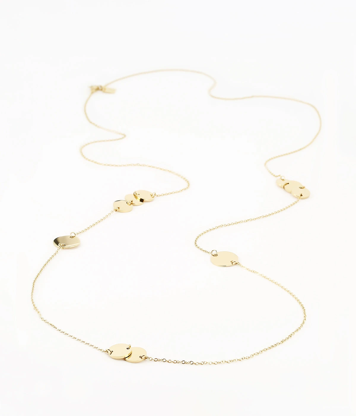 Collier long en acier uni ou doré à l’or fin sur lequel sont serties des petites plaques rondes brillantes. Ce sautoir s’installe avec finesse et éclat sur le décolleté.