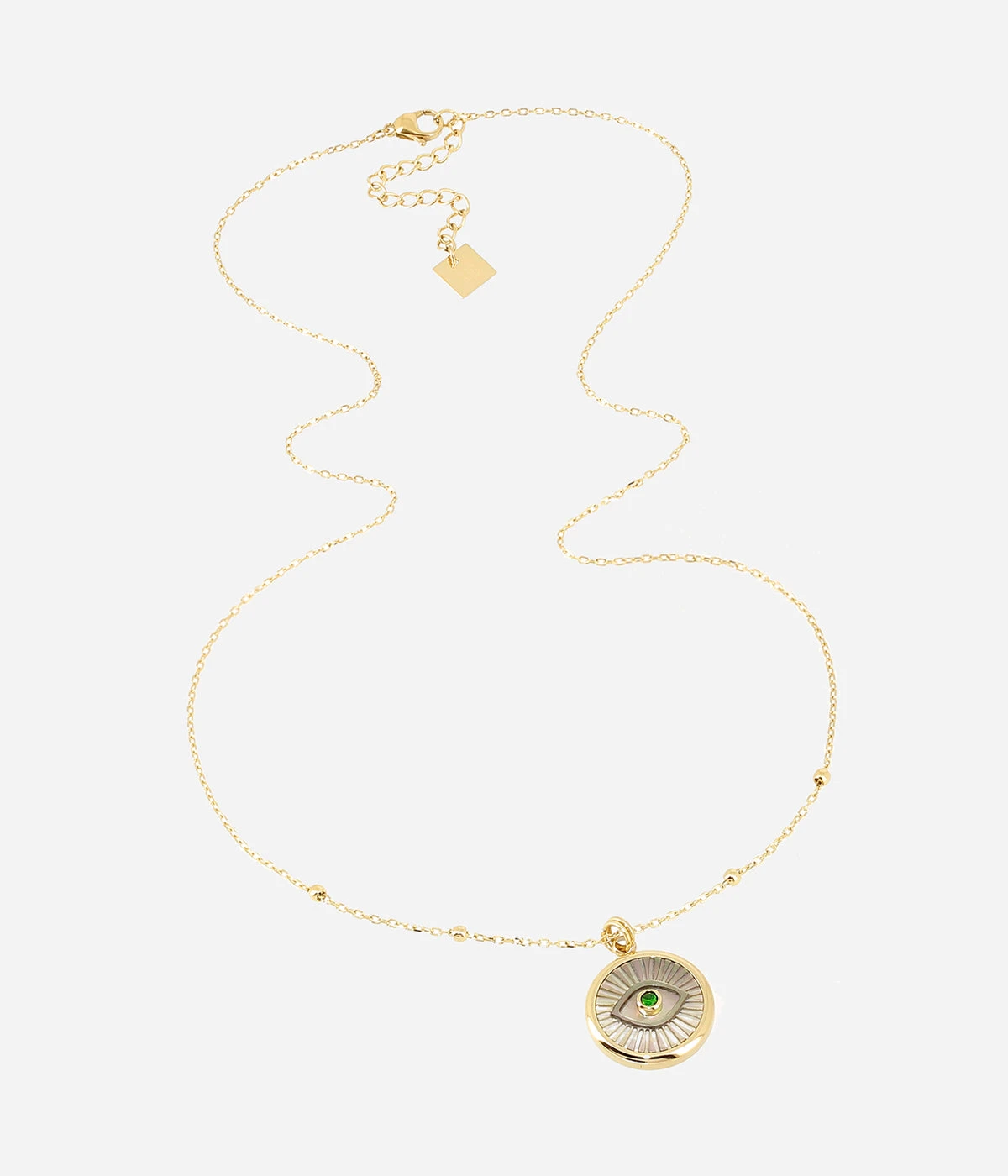 Sautoir en acier doré à l’or fin avec un médaillon qui arbore une pierre naturelle taillée en forme d’œil.