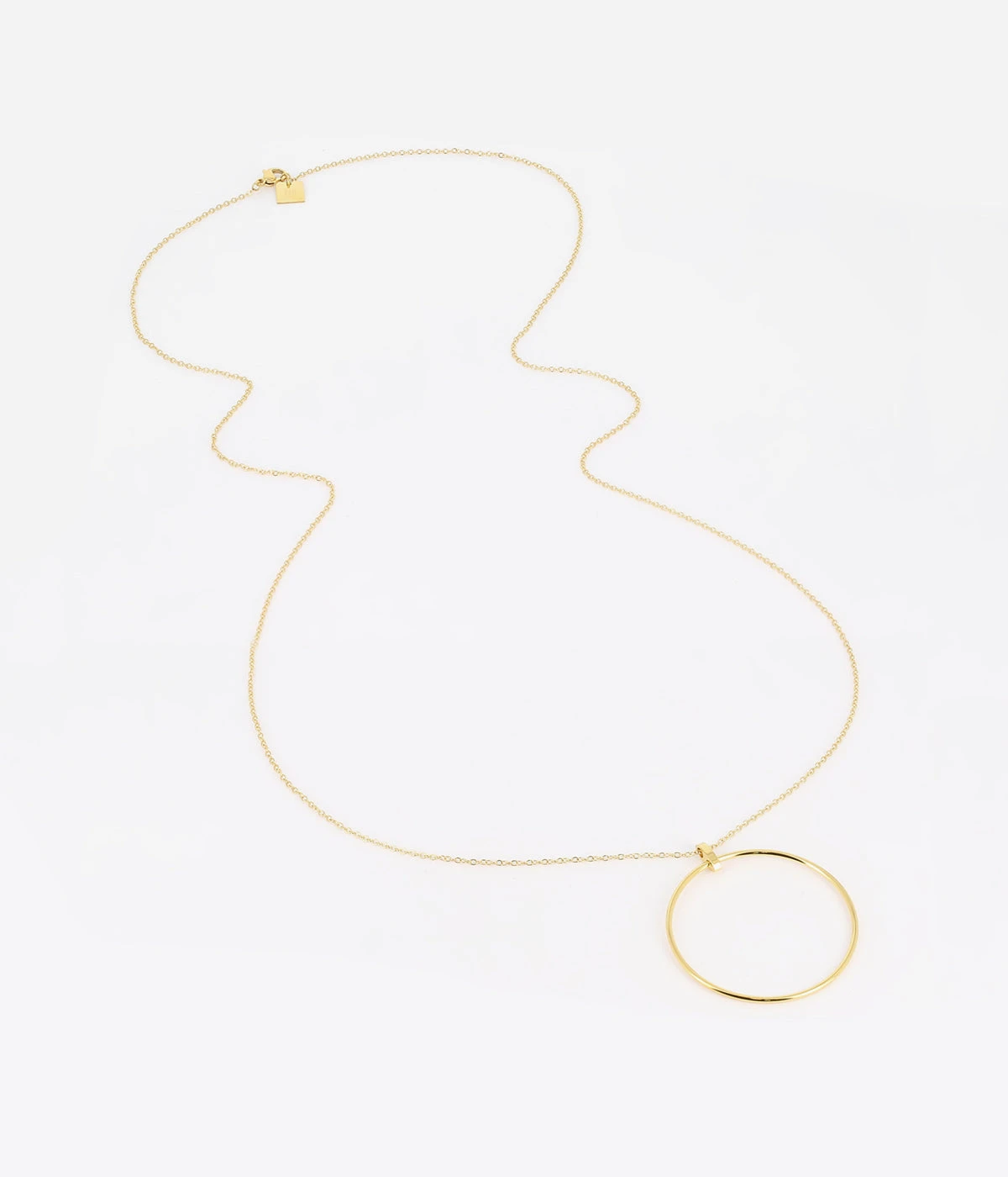 Collier long en acier uni ou doré à l’or fin sur lequel est suspendu un pendentif en forme de cercle.