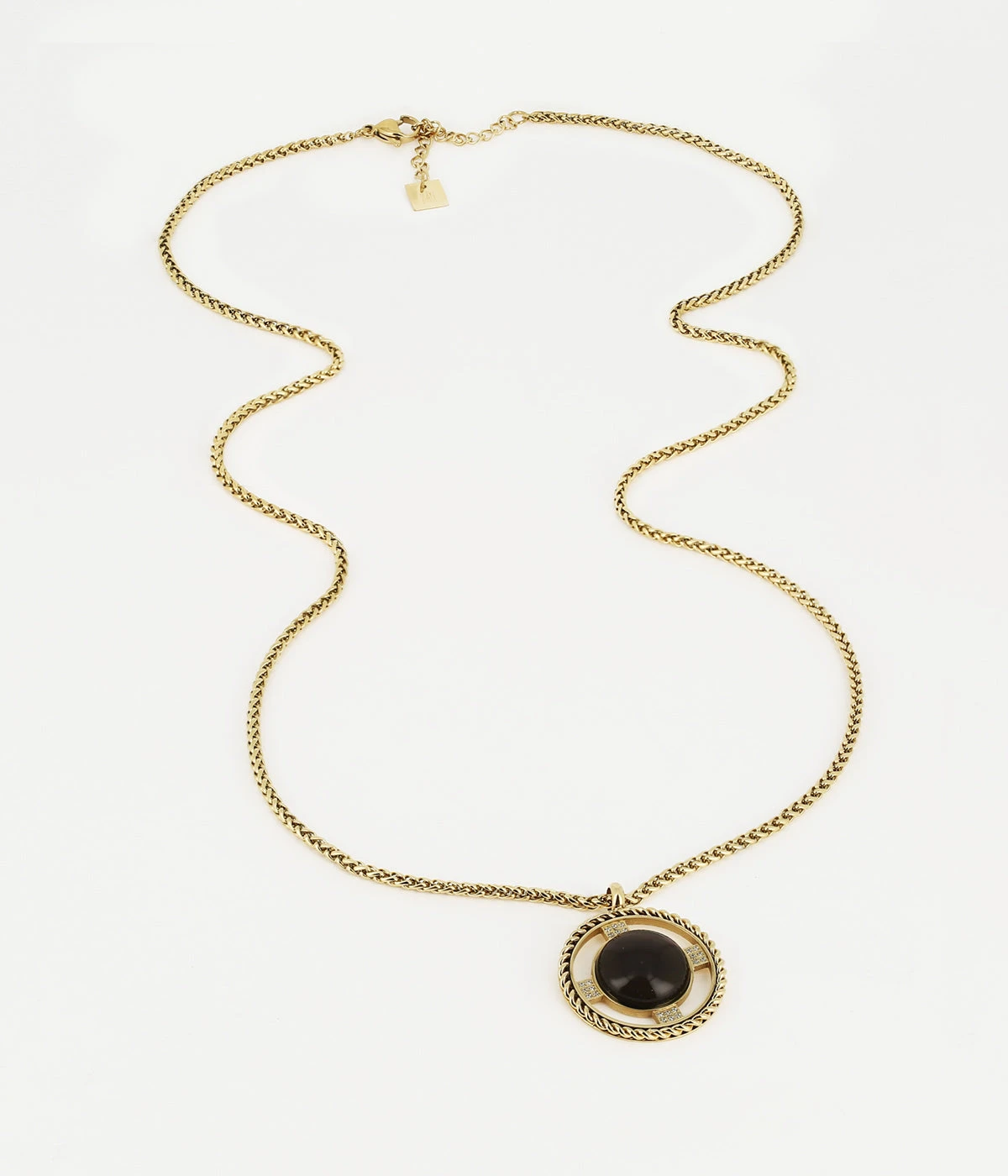 Collier long en acier doré à l’or fin sur lequel est suspendu un pendentif doté d’une pierre naturelle en son centre et serti de zirconiums.